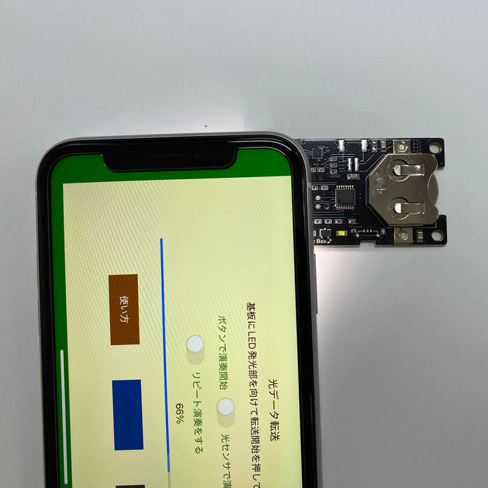 - スマホアプリ「オルゴール工房」(無料)で作成した曲を演奏できる基板です