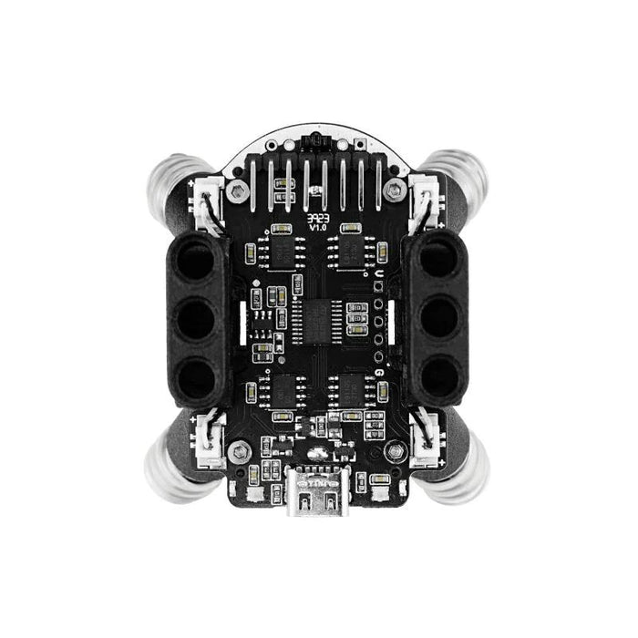 四つのL9110SモータードライバとDCギアモーター、コア制御チップのSTM32F030F4、二つのプログラマブルRGB LED、赤外線レシーバ、専用バッテリーホルダを搭載しています。上部のスロットにM5StickCコントローラを接続し、I2Cプロトコル(アドレス0x38)経由で制御コマンドを受信します。