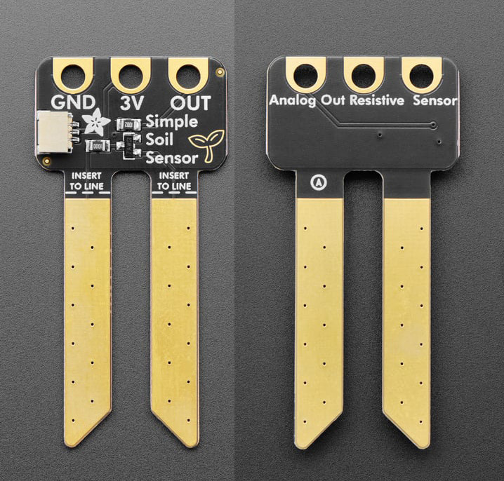 - 土壌電極 - ボードの金メッキ電極を土に埋め、抵抗値を読み取ることで電極間の導電率を割り出し、土壌の水分レベルを決定します。