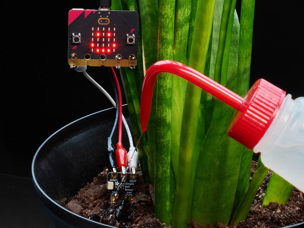 micro:bitで使用する場合には、小型のワニ口クリップが必要です。micro:bitのGND/3V/0パッドからセンサのGND/3V/OUTパッドに接続してください(1または2パッドも使えます)。その後、micro:bitでアナログ値を読み取ります。土が乾燥していれば、読み取りデータは100未満に、湿るにつれて1000まで上昇するでしょう。