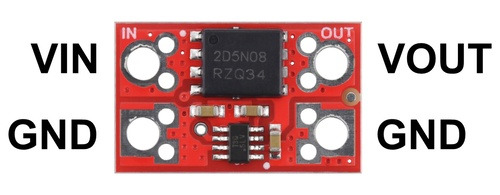 電源とグラウンドはVINとGNDに、負荷はVOUTとGNDに接続してください。電源が正しく接続されると電源がVOUTに出力されます。間違って接続した場合は、電源は出力には流れず、負荷は逆接された電源電圧から保護されます。