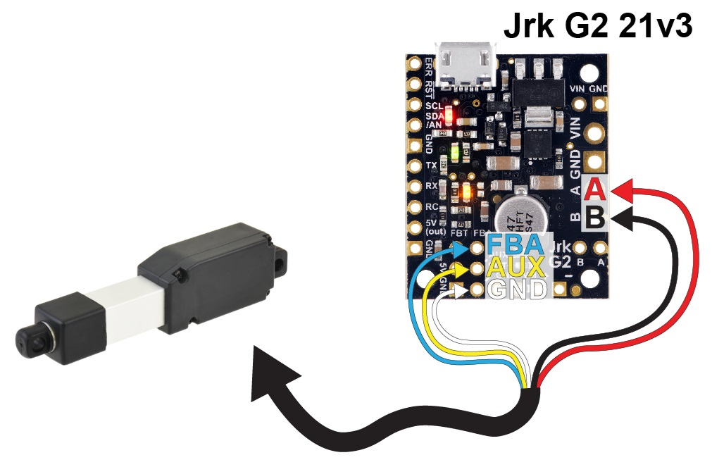 本製品には、ストローク端で電源を遮断するリミットスイッチが備わっていません。フィードバック機能を備えた Jrk G2 21v3 モーターコントローラを併用することで、ポテンショメータからの信号に基づいた安全な位置制御が可能になります。専用の設定ファイルを使用することで、面倒なPID定数の調整なしでセットアップを完了できます。