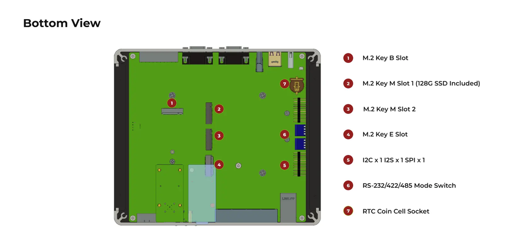 2 x M.2 Key M スロット(SSD用)、M.2 Key E スロット(Wi-Fi 用)、M.2 Key Bスロット(4G/5G用)を搭載 - 広範なな入力電圧