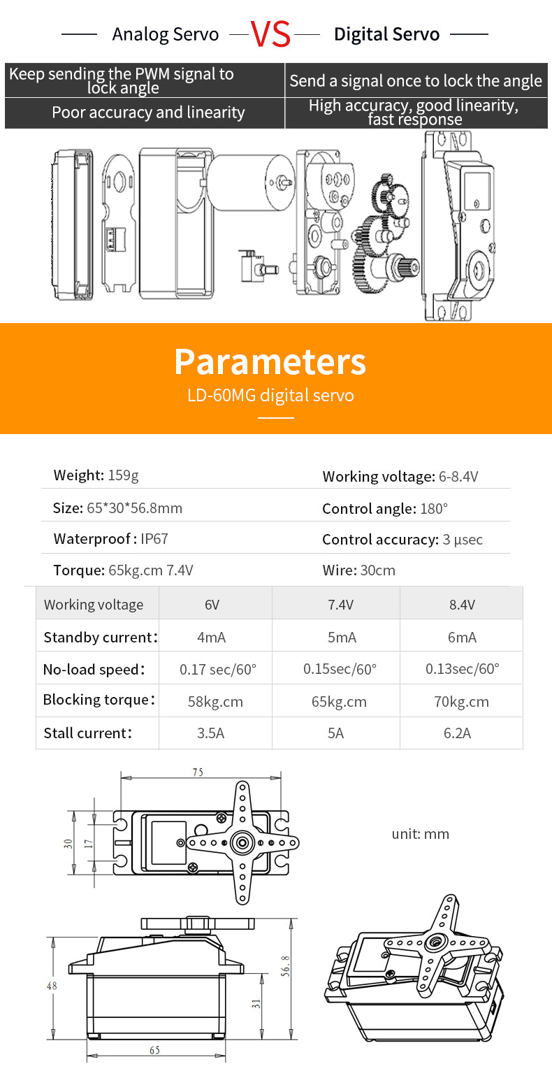 60 kgトルクのフルメタルギアデジタルサーボです。IP67防水つき。