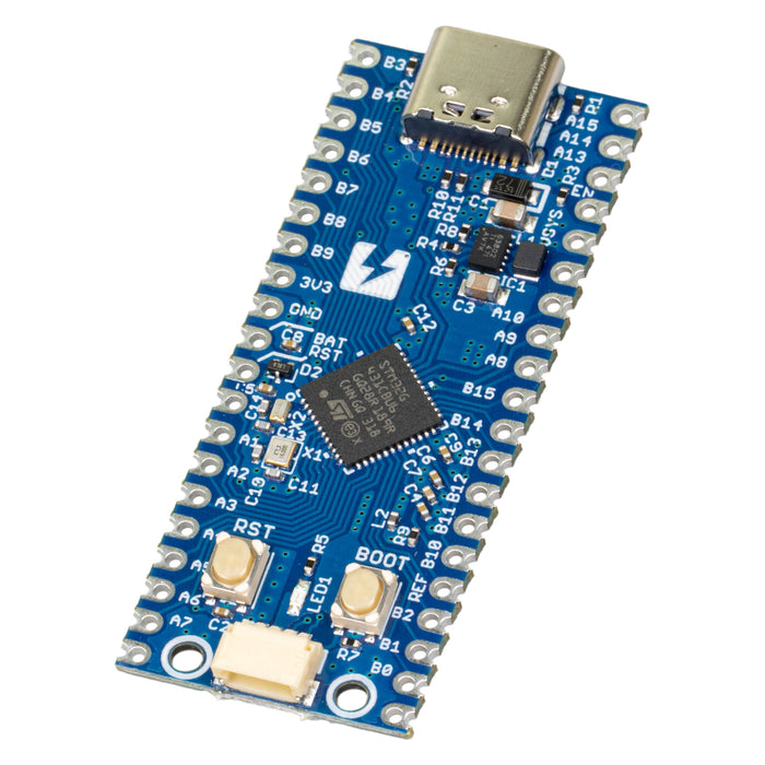 STマイクロエレクトロニクスの32 bitマイクロコントローラー「STM32G431CBU6」を搭載したコンパクトな開発ボードです。組込み開発・IoT機器、ブラシレスモーターのコントローラーに最適なマイコンボードです。コアはArm Cortex-M4(FPU搭載)で最大170 MHzで動作し、128 KBのFlashメモリと32 KBのSRAMを搭載しています。