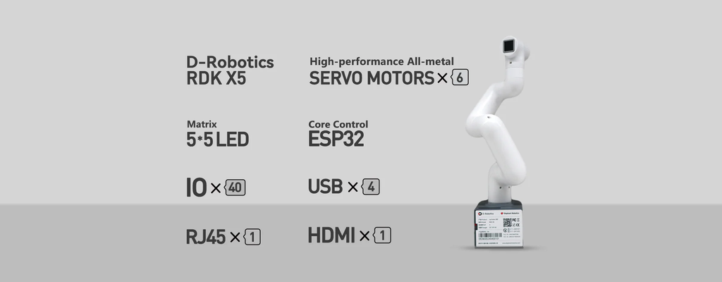 myCobot 280 RDK X5は、RDK OS(ROS 2 humbleベース)を搭載したD-Robotics RDK X5をベースしています。最大10 TOPSの演算能力を備え、Transformer、RWKV、Occupancy、Stereo Perception、最新のアルゴリズムなど、複雑なモデルをローカルで実行できます。これにより、開発者はロボットアプリケーションを迅速かつ柔軟に構築・展開できます。