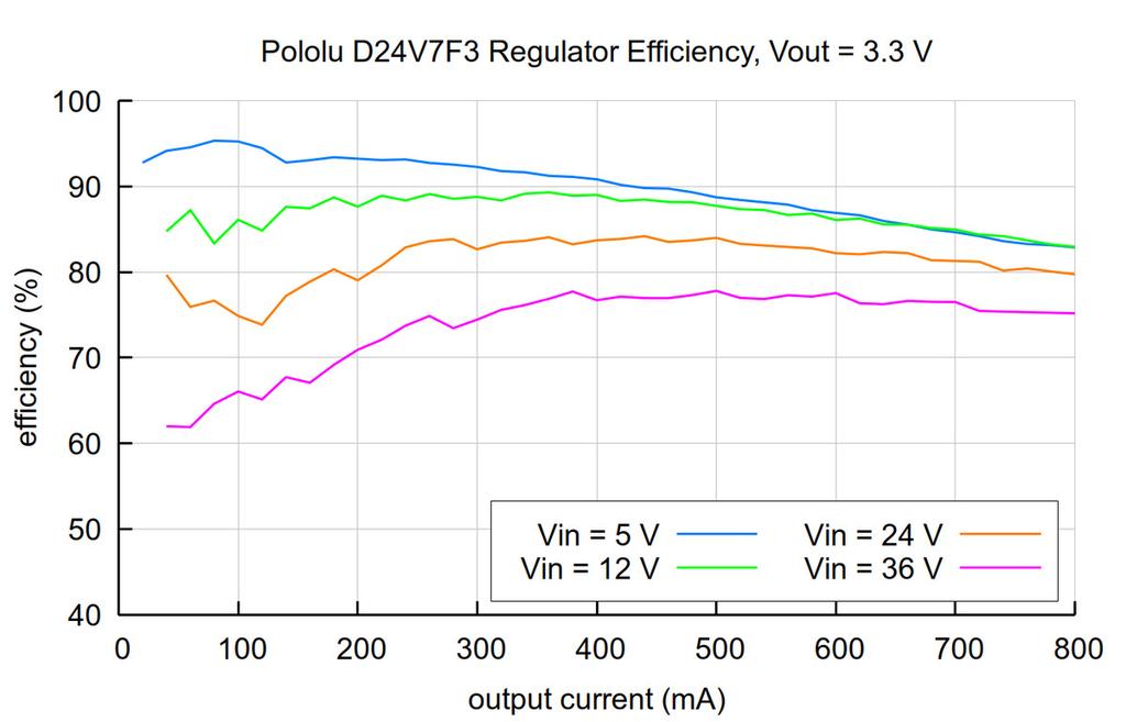 D24V7Fシリーズの同期整流方式のステップダウン(降圧)レギュレータで、最大36 Vの入力電圧から最大600 mAの連続出力をサポートします。スイッチングレギュレータのため、特に入力電圧と出力電圧の差が大きい場合にリニアレギュレータよりも遥かに高い効率を実現します。