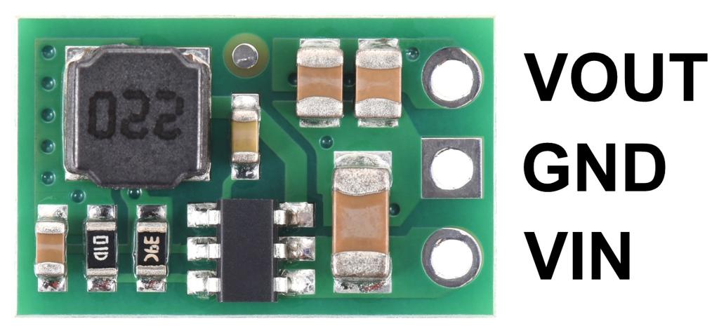入力電圧 (VIN)、グランド (GND)、出力電圧 (VOUT) の三つのスルーホールがあります。三端子レギュレータと同様のピン配置(部品面から見てVIN、GND、VOUT)ですので、ピンヘッダ等をはんだ付けしてブレッドボードやユニバーサル基板で活用できます。