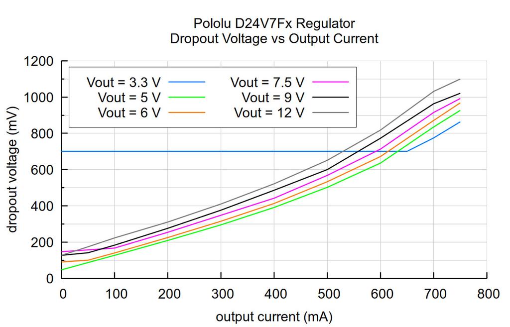 入力電圧VINの下限は、VOUTにレギュレータのドロップアウト電圧を加えた値です。ドロップアウト電圧は負荷に応じてほぼ直線的に変化します (ドロップアウト電圧のグラフ御参照)。