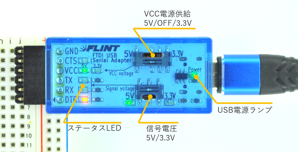 - 信号電圧レベル切り替えスイッチ:5V・3.3V(CTS/TX/RX/DTR)
