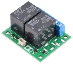 12 VDCリレー2チャンネル、ターミナルブロック(スイッチ接続用)、トップ型JST SHコネクタ(制御信号接続用)が搭載された最大定格10 Aの単極双投(SPDT)リレーボードです。
