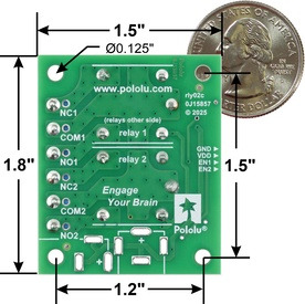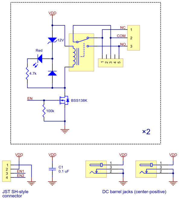 リレーのスイッチ部分は3ピンターミナルブロック(NCx、COMx、NOx)から引き出せ、制御ピン(GND、VDD、EN1、EN2)は反対側の3ピンJST SHコネクタに配線されています。12 VリレーのコイルはVDD-GND間の12 Vで給電され、対応するENピンをhigh(2.5 V~20 V)にすると作動します。制御信号は直接NチャンネルMOSFET BSS138Kにフィードされ、制御電圧が約2.5 Vを超えるとコイルがONになります。各リレー両側にある赤LEDはコイルがONになると点灯します。キャリアボードには取付穴(#2またはM2用)が4箇所あります。