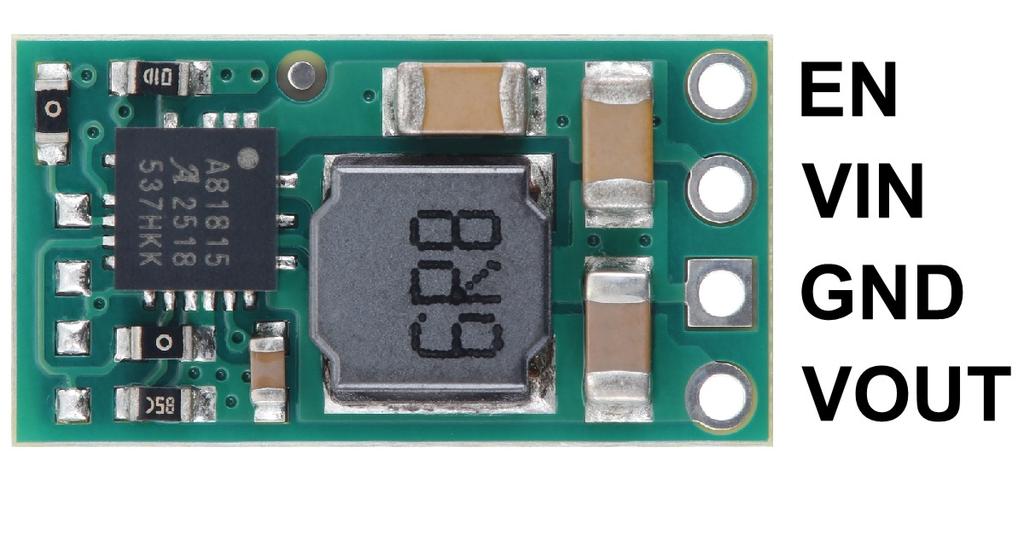 イネーブル(EN)、入力電圧 (VIN)、グランド (GND)、出力電圧 (VOUT) の四つのスルーホールがあります。EN端子が1.05 V以下になった場合シャットダウンモードに入り、ふたたび1.2 Vを超えると動作モードに戻ります。EN端子は基板内でプルアップされ、未接続時は動作モードになるので、3ピンのピンヘッダをハンダ付けすれば「三端子レギュレータ」と同様に使えます。