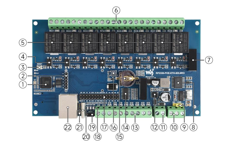 | 2 | PoEヘッダ | PoE用子基板が実装されています。PoE非対応版の 8ch絶縁入力リレーモジュール(RP2350搭載、Ethernet ・RS-485対応) ではPoE用子基板は実装されません |