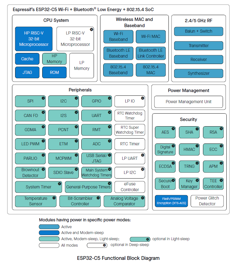 ESP32-C5-WROOM-1は、低消費電力の32 bit RISC-Vプロセッサ(最大48 MHzで動作)を統合しており、スリープモードでも動作可能です。