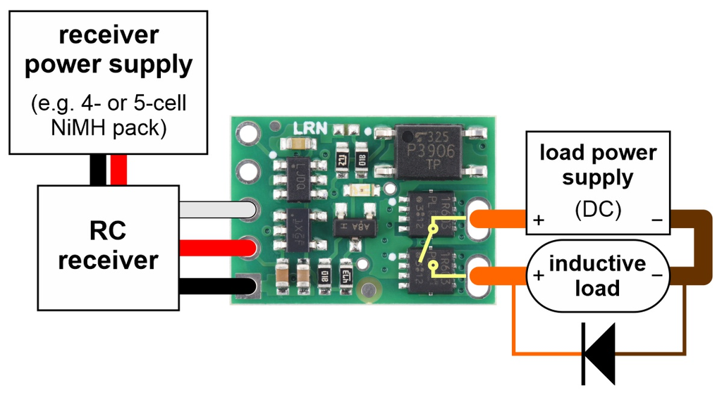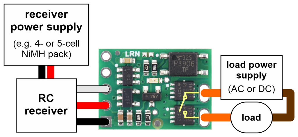 スイッチ制御回路は2.7 V〜16 Vで動作します。この電圧は一般的なRCレシーバーの範囲より広く、RCレシーバーやサーボコントローラ自体から給電可能です。