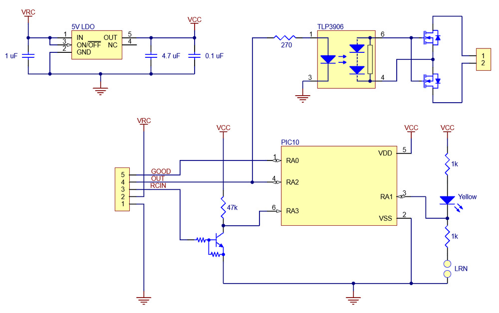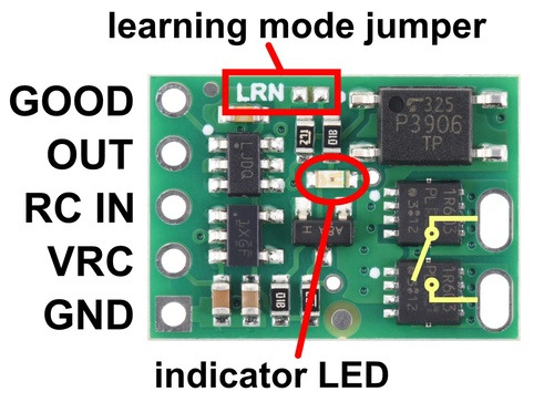 入力RCパルス幅を測定し、ユーザ設定可能な閾値(±64 µsのヒステリシス付き)と比較して、リレーの起動を決定します。デフォルトの閾値は約1700 μsで、それ以上長いパルスで起動します。スイッチには学習モードがあり、閾値と方向は設定可能です。セーフスタート機能により予測しない起動を減少させます。