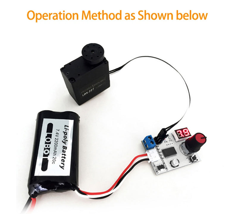 1チャンネルを扱えるサーボテスター/コントローラです。装置についているノブを回すことでサーボを手動で操作することができます。ターミナルブロック(端子台)からの電源供給の他、リチウム電池(※)からも電源を供給することができるため、外出先でサーボをテストする用途にも最適です。
