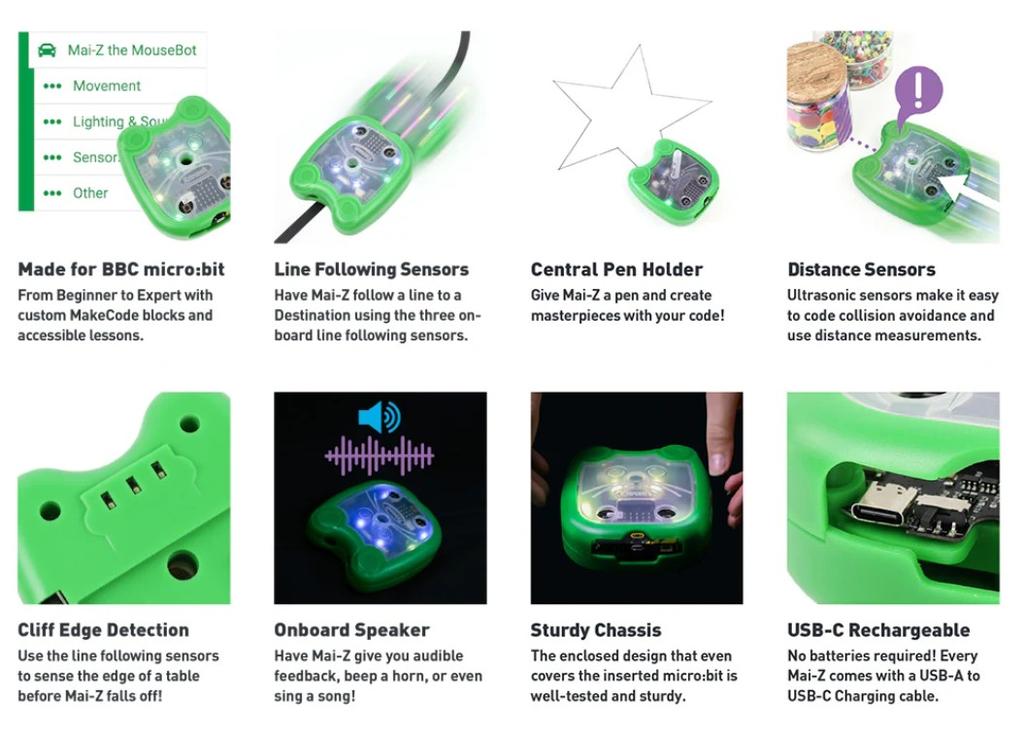 主な機能 : ライン追跡センサ、距離センサ、エッジ検出センサ、プログラム可能なZIP LED x 4、ペンホルダー、スクープ、micro:bit A/Bボタンアクセス用のボタンホール、micro:bitエッジコネクタ、リチウムイオン電池、スピーカー、USB-C充電ポート、オン/オフスイッチ、ステータスLED。