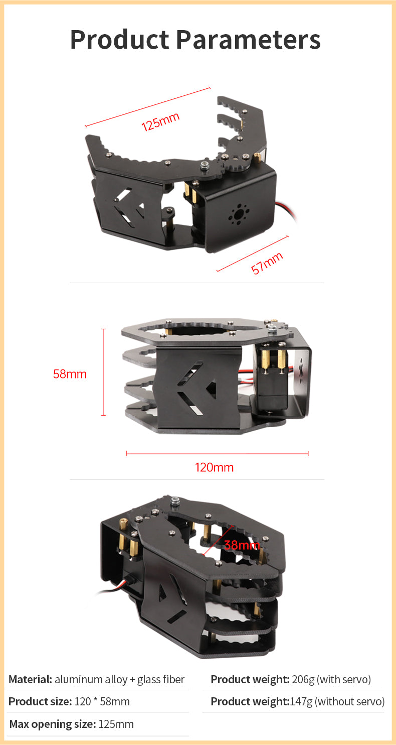 - 高トルクで高パフォーマンス、焼きつき防止性能を備えたサーボ。500gまでのものをつかむことが可能。
