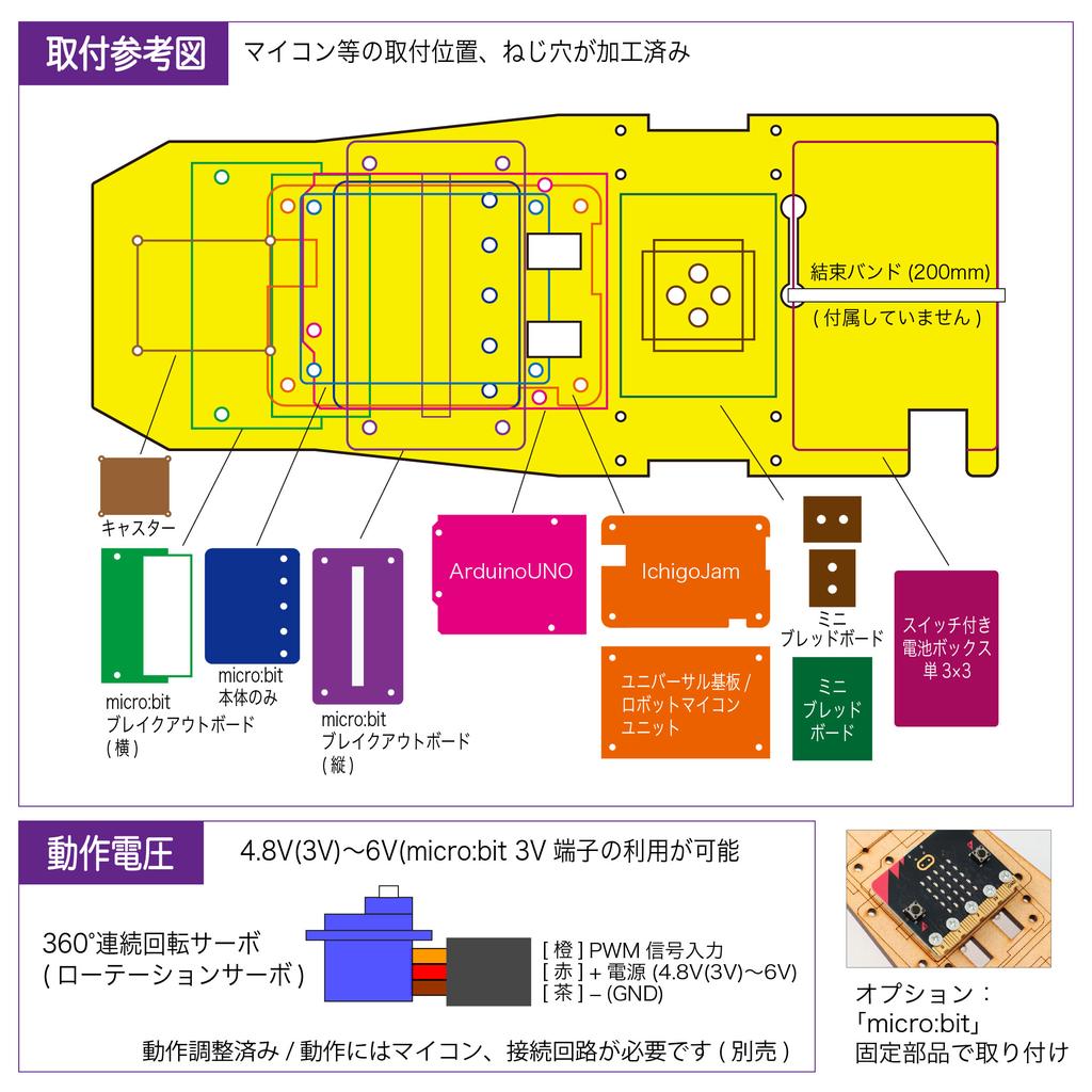 • 別売のマイコン(micro:bitArduino、IchigoJam等)を利用して簡単にコントロール