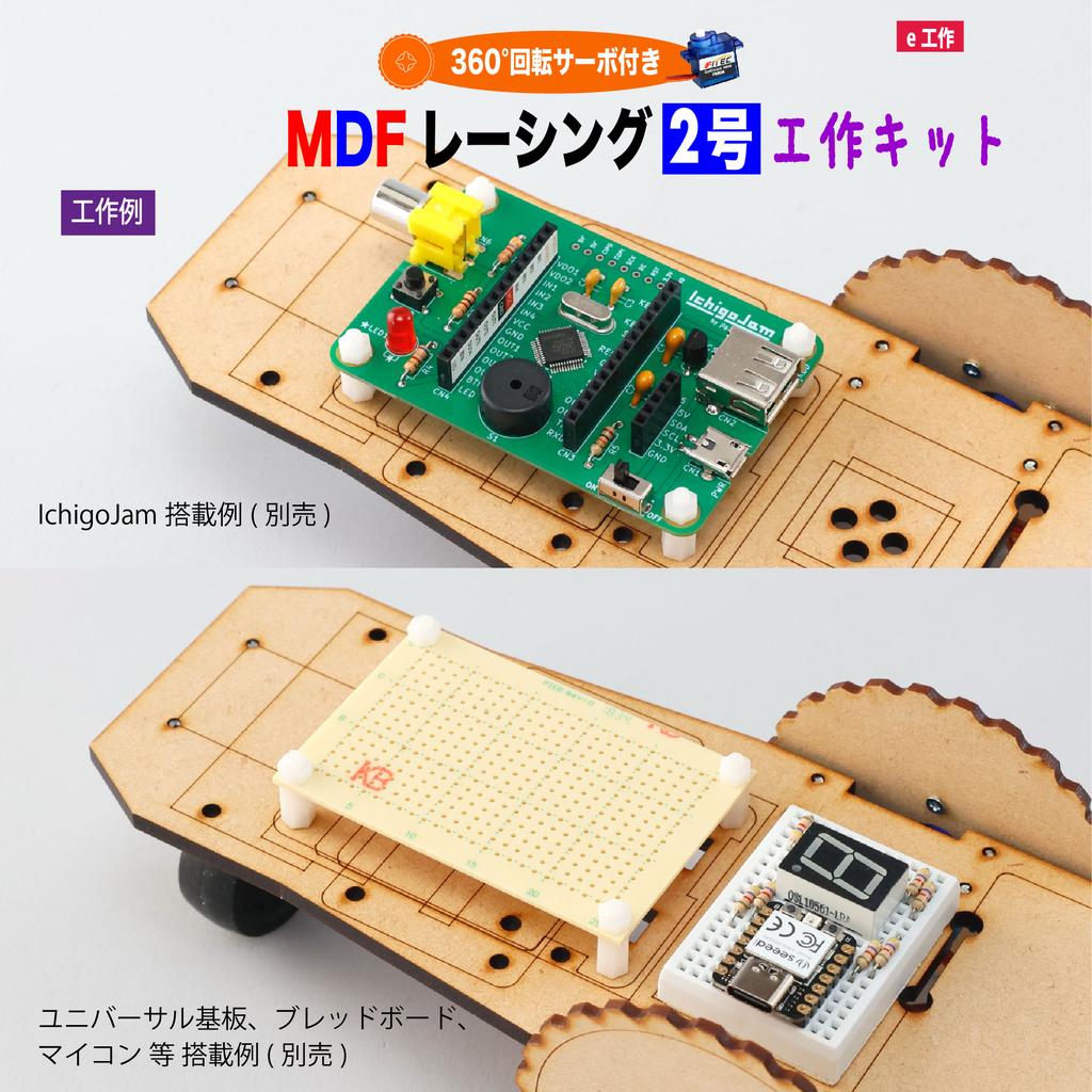 360°連続回転サーボを動力源としたレーシングカー「MDFレーシング2号」工作キットです。サーボを動かすPWM信号によって車輪の回転方向(前/停止/後)、スピードコントロールが可能。左右の車輪をコントロールすることで自在に走行できます。動かすためには別売のマイコン(micro:bitArduino、IchigoJam等)と周辺回路やケーブル類が必要。センサーを搭載して自律走行させるなど、自分だけのオリジナルマシーンを作って競走させよう!!