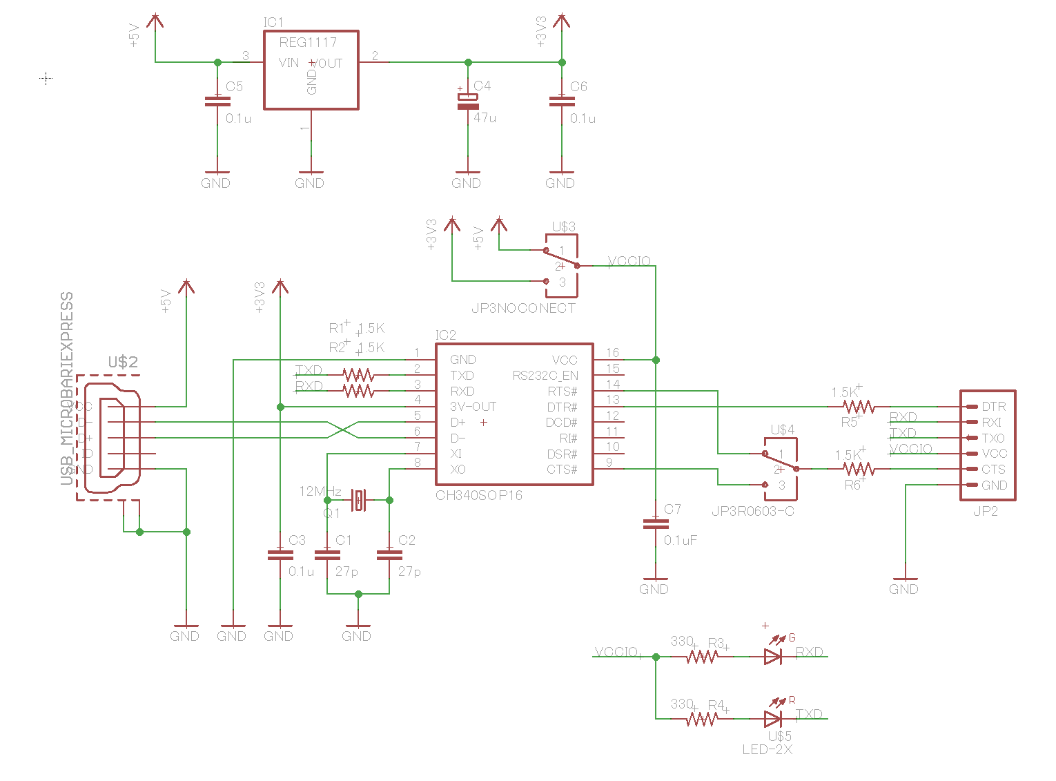 電源電圧はジャンパーピンによって、ハイパワー3.3 VとUSB直結の5 Vを選択することができます。また、このUSBシリアル変換ではESP8266やESP32Sモジュールの書き込み時にnodemcu法などの自動リセットができるよう、RTS、DTR端子を標準で用意しています。背面の切り替えジャンパーによってRTS端子を、Arduino pro miniなどで必要なCTS端子に切り替えることも可能です。