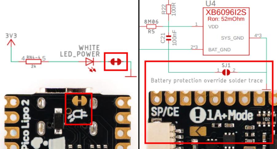 • 800 mAを超える高負荷用途では、「+1A Mode」とラベル付けされたパターンにハンダ付けすることで、バッテリープロテクターをバイパス可能です(上の画像右)。この作業を行う前に、ご使用のバッテリーがこの電流量を安全に供給できることを必ず確認してください。