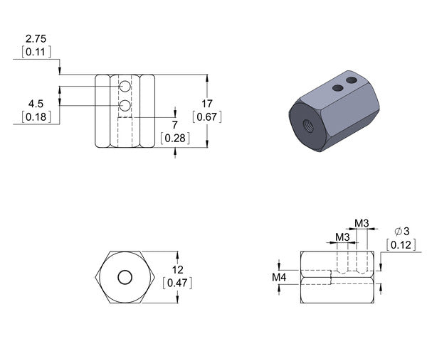 直径3 mmのシャフトを、一般的なホビーRC用六角穴付ホイールと適合する六角シャフトに変換するアルミ製アダプタです。長さは17 mmです。ホイール側はM4ネジで、シャフト側はM3イモネジ2本で取り付けます。