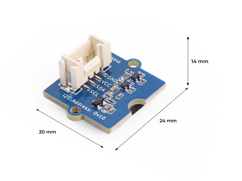 VEML6040が搭載された、GROVEケーブルでI2C接続できる、物体の色を測定するセンサです。外部同期入力により外部パルス光源との高精度な同期制御が可能です。