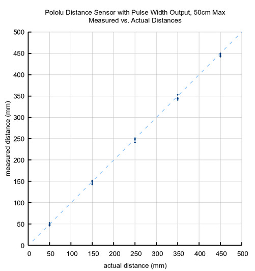 最大検出距離は物体の反射率と周辺光条件に依存します。pololu社のテストでは、白い紙のシートを約50 cmまで、手を約30 cmまで検出できました。グラフは、白い紙のターゲットをいくつかの異なる距離で、実際の距離と5台のユニットによる測定値を比較したものです。
