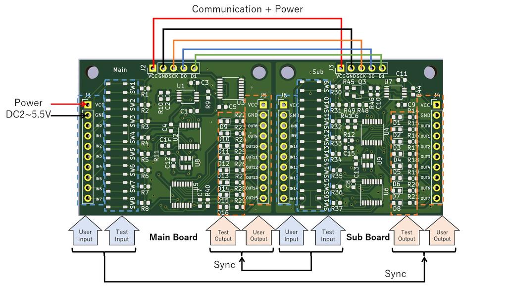 本基板はIO信号をシリアル化してメイン基板とサブ基板間で同期する基板セットです。ボタンやLED等のユーザ入出力の配線を省配線化する際に便利です。本基板を使用すると信号線3本のみで双方向に8入力/8出力の計16信号を伝送できます。