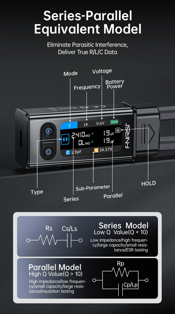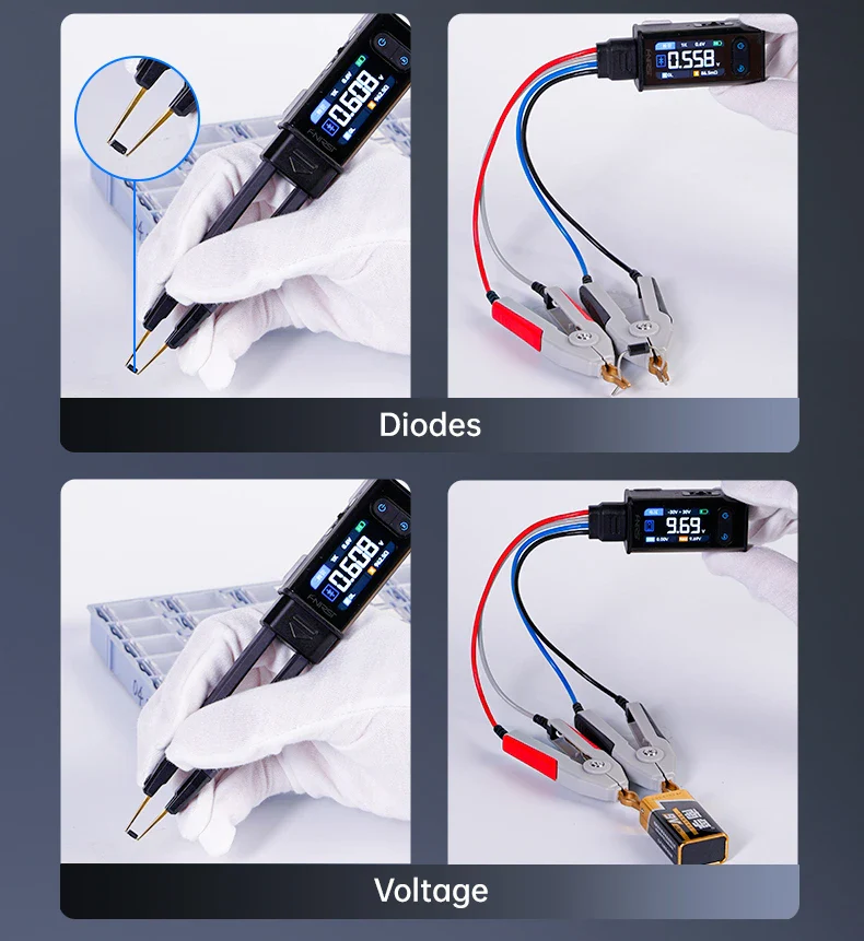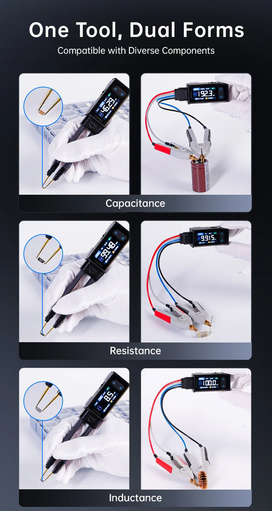 ピンセットとケルビンクリップに対応したコンパクトなデュアルモード LCR メーターです。五つのテスト周波数と1.47インチHDディスプレイを備え、 抵抗、静電容量、インダクタンス、ダイオードの測定に加え、最大30 Vまでの電圧測定に対応します。