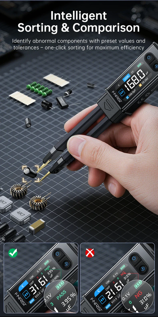抵抗(10 mΩ~10 MΩ)、容量(1 pF~22 mF)、インダクタンス(1 μH~10 H)、ダイオード(≤0.7 V)、電圧(±30 V)を正確に測定 - 包括的な電子パラメータ