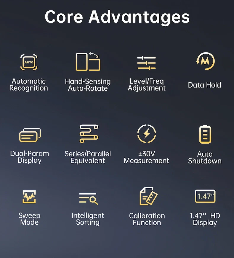 抵抗/キャパシター/インダクタンスのコンポーネント自動認識、デュアルパラメータ表示、HOLD/Max/Min、調整可能なシステム設定 - 自動スクリーン回転機能