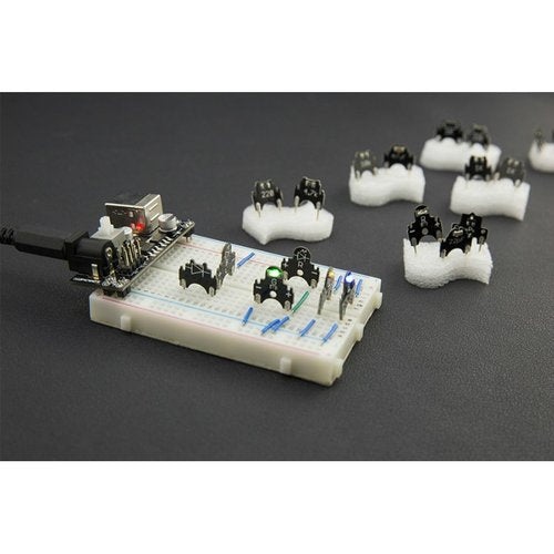 Breadboard-Plugin Components Pack is a new kit designed for breadboard experiment. It provides many kinds of components, such as resistors, capacitors, diodes, transistor .etc. The module pins are using gold-plating technology, solid and durable. It could be plugged on the breadboard directly. easy, reliable and reusable.